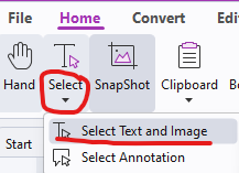 4. Finally, in the Home tab click on the 'Select' drop down and choose 'Select Text and Image'